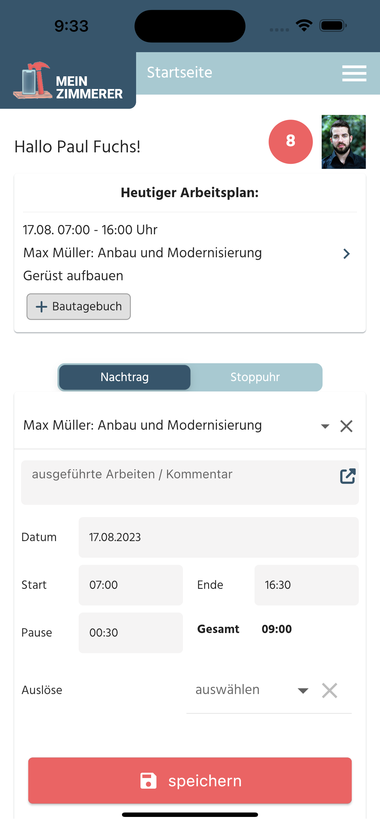 Es ist wichtig, dass die Mitarbeiter auf den Baustellen an die Daten kommen. Wir stellen den Kapos, also Vorarbeitern, auf der Baustelle Tablets und den Mitarbeitern Handys, auf denen die Steinmetz-App läuft. Die App basiert auf „Mein-Zimmerer-App“. Es sind die Arbeitspläne und Aufträge sichtbar, sodass die Mitarbeiter sehen, wann sie wo eingeplant sind. Außerdem läuft die Zeiterfassung darüber, das Zeitkonto ist einsehbar und sie können chatten, Regieberichte, Baustellendokumente, Krankmeldungen, Maschinen-, Routenplanung, Materialverbrauch und Materialbestellungen u.v.m. nutzen.